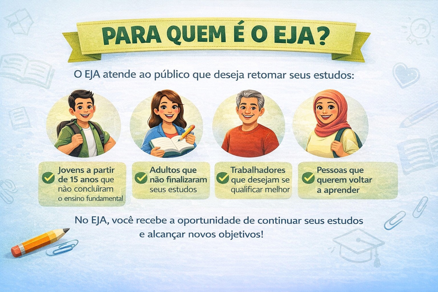 Nunca é tarde para retomar os estudos. A Educação de Jovens e Adultos (EJA) é uma oportunidade para quem não concluiu o Ensino Fundamental e deseja voltar a aprender, melhorar de vida e abrir novas portas no mercado de trabalho.