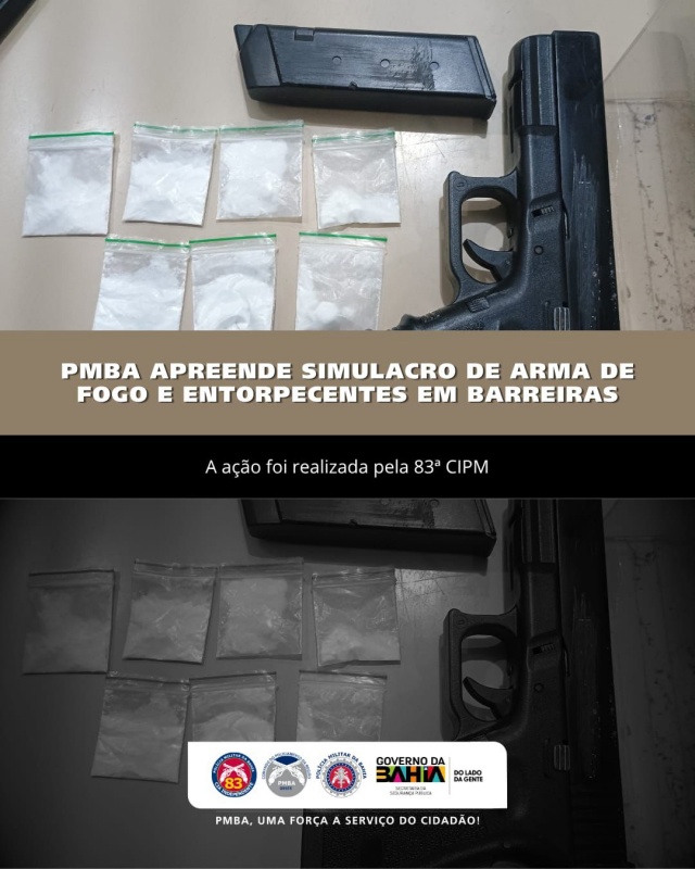 A Polícia Militar da Bahia informa que, na data deste sábado (25), guarnições da 83ª CIPM e da Operação Paredão realizaram a apreensão de um simulacro de arma de fogo e entorpecentes nos bairros Sandra Regina e Vila Nova, em Barreiras.