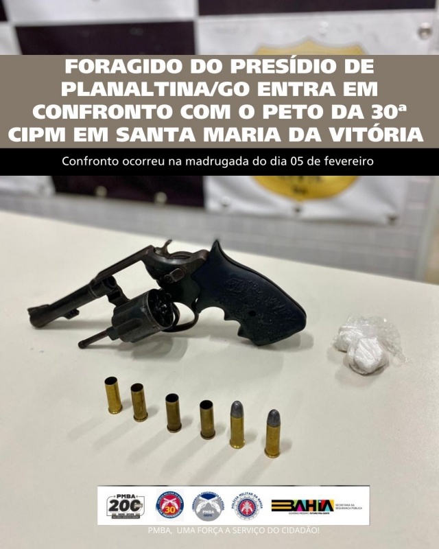 Nesta quinta-feira (05), por volta das 01h15min, após informações compartilhadas entre o Setor de Inteligência da Polícia Penal de Goiás, CPR-MO e a 30ª CIPM, sobre a localização de indivíduos foragidos da Unidade Prisional Regional de Planaltina/GO, a guarnição do PETO da 30ª CIPM, juntamente com a Operação Oeste em Paz, iniciou diligências para localizar os foragidos. Durante as buscas, foi identificado um dos indivíduos, qualificado como THIAGO NERES DE ARAÚJO, de 37 anos, na área de mata, bairro Macambira, zona rural, ponto de referência: Loteamento Alto do Paraíso no município de Santa Maria da Vitória.