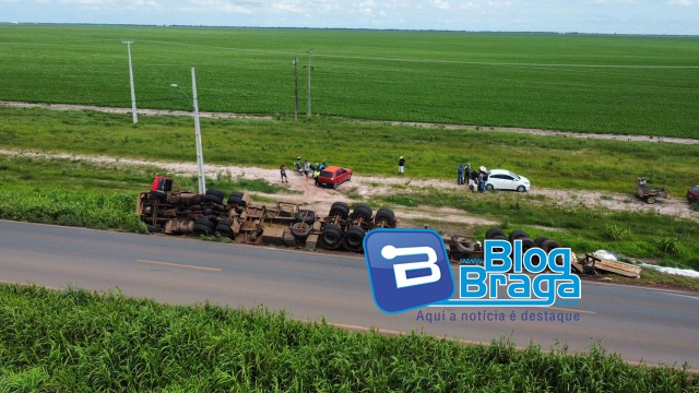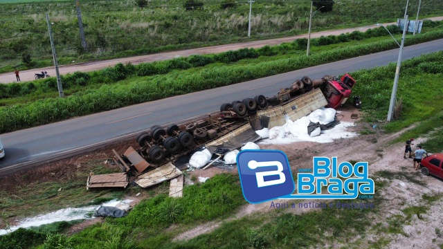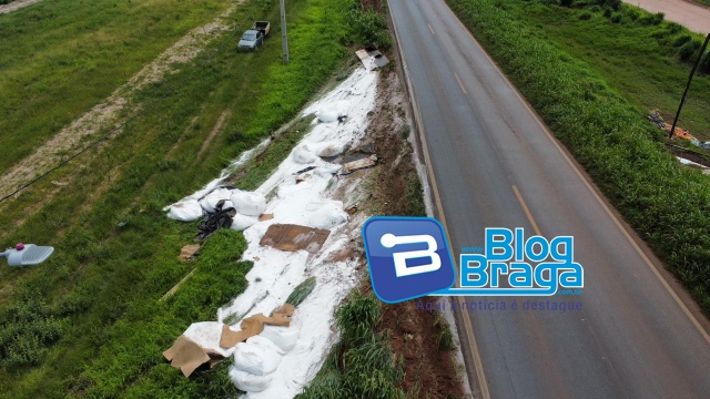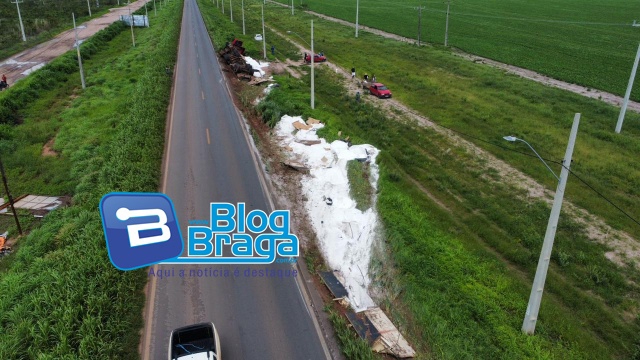 A carga alta fez com que o veículo pendesse para a esquerda ao entrar na rotatória e então aconteceu o acidente. A carga ficou espalhada pela pista interditando o acesso à Avenida Aylon Macedo sentido centro da cidade.
