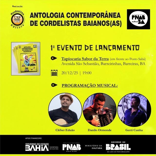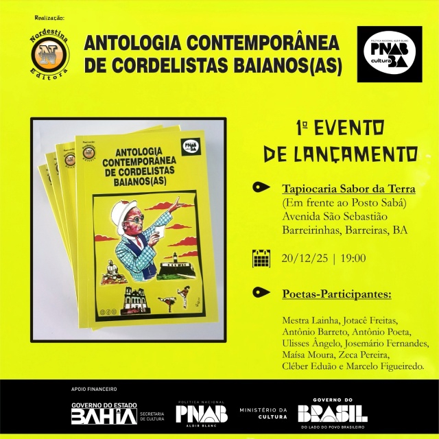 Acontecerá neste sábado (20), às 19h em Barreiras (Ba), o primeiro evento de Lançamento da Antologia Contemporânea de Cordelistas Baianos (as). O local do evento será na Tapiocaria Sabor da Terra (em frente ao posto Sabá), Avenida São Sebastião, Barreirinhas.