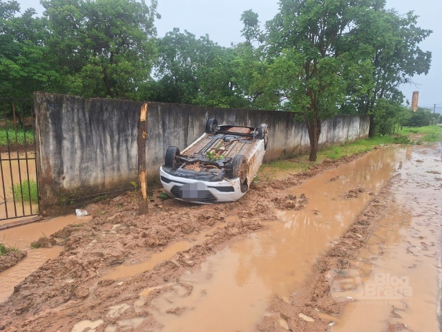 A guarnição esteve no local e fez o registro do sinistro. A pista estava molhada no momento do ocorrido. A guarnição, ao chegar no local, constatou que o carro estava do lado de fora da pista capotado, e o SAMU já havia saído do local após prestar o socorro.