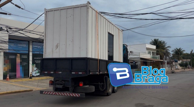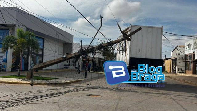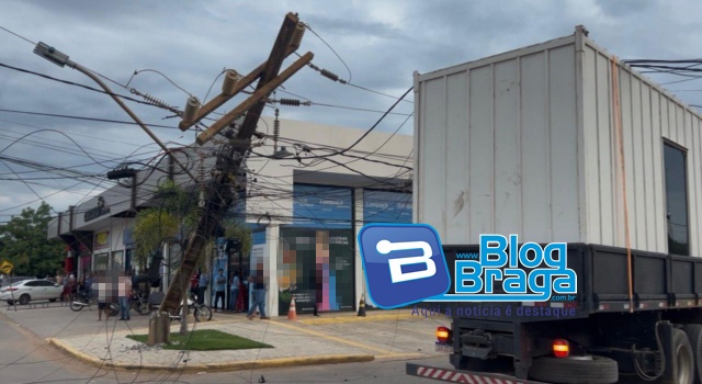 De acordo com informações, o veículo transitava pela rua São Francisco e, ao entrar na rua Minas Gerais, transportando um contêiner, acabou enroscando em fios e derrubando o poste da esquina. Na sequência, outros dois postes também caíram.