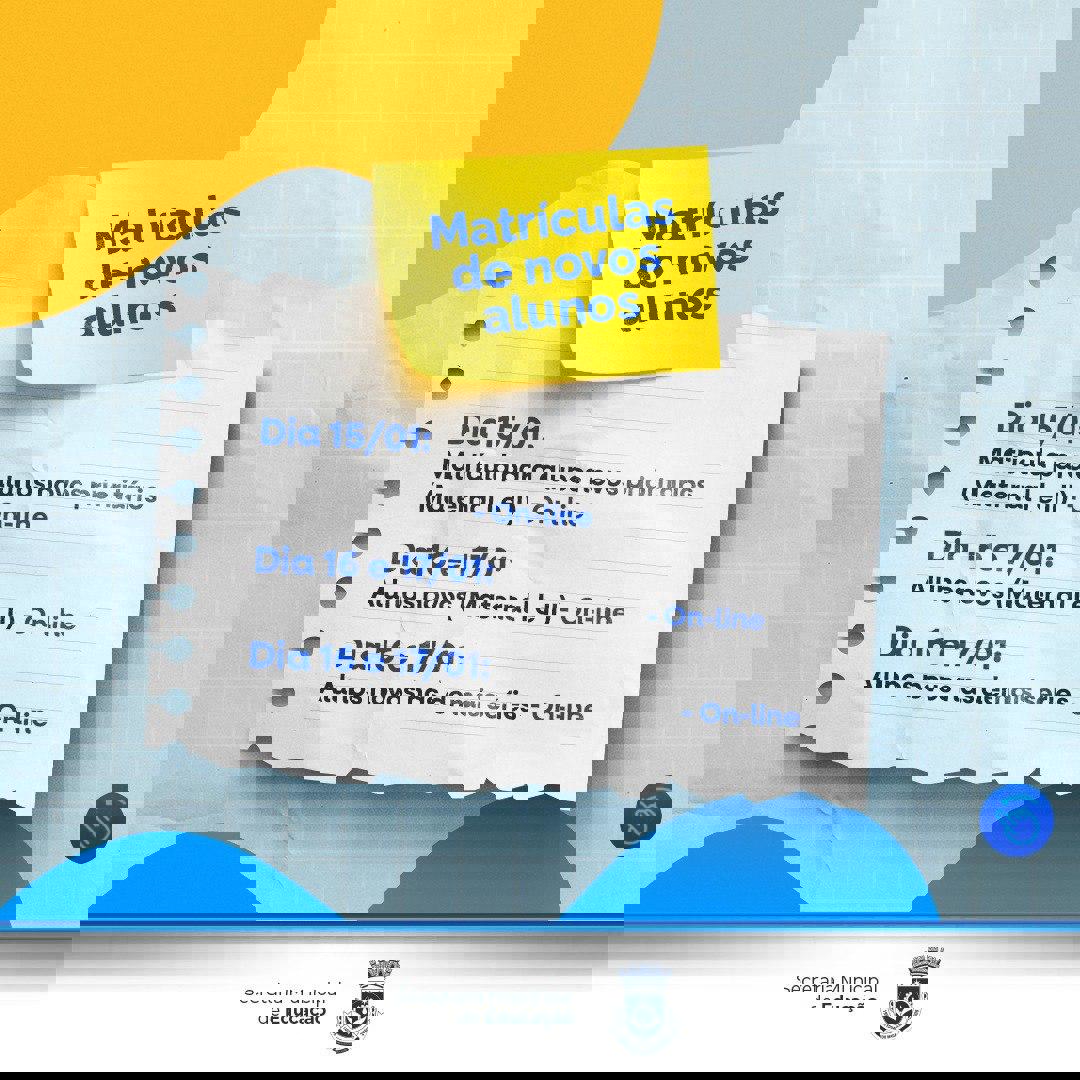 A matrícula de alunos novos prioritários nas creches Maternal I e II, acontecerá no dia 15 de janeiro de 2025, também de forma on-line (alunos prioritários são aqueles beneficiários do Programa Bolsa Família). Nos dias 16 e 17 será a vez dos alunos novos nas creches Maternal I e II. Também nos dias 16 e 17 de janeiro de 2025, acontecem as matrículas de alunos novos nas demais séries/modalidades de ensino.