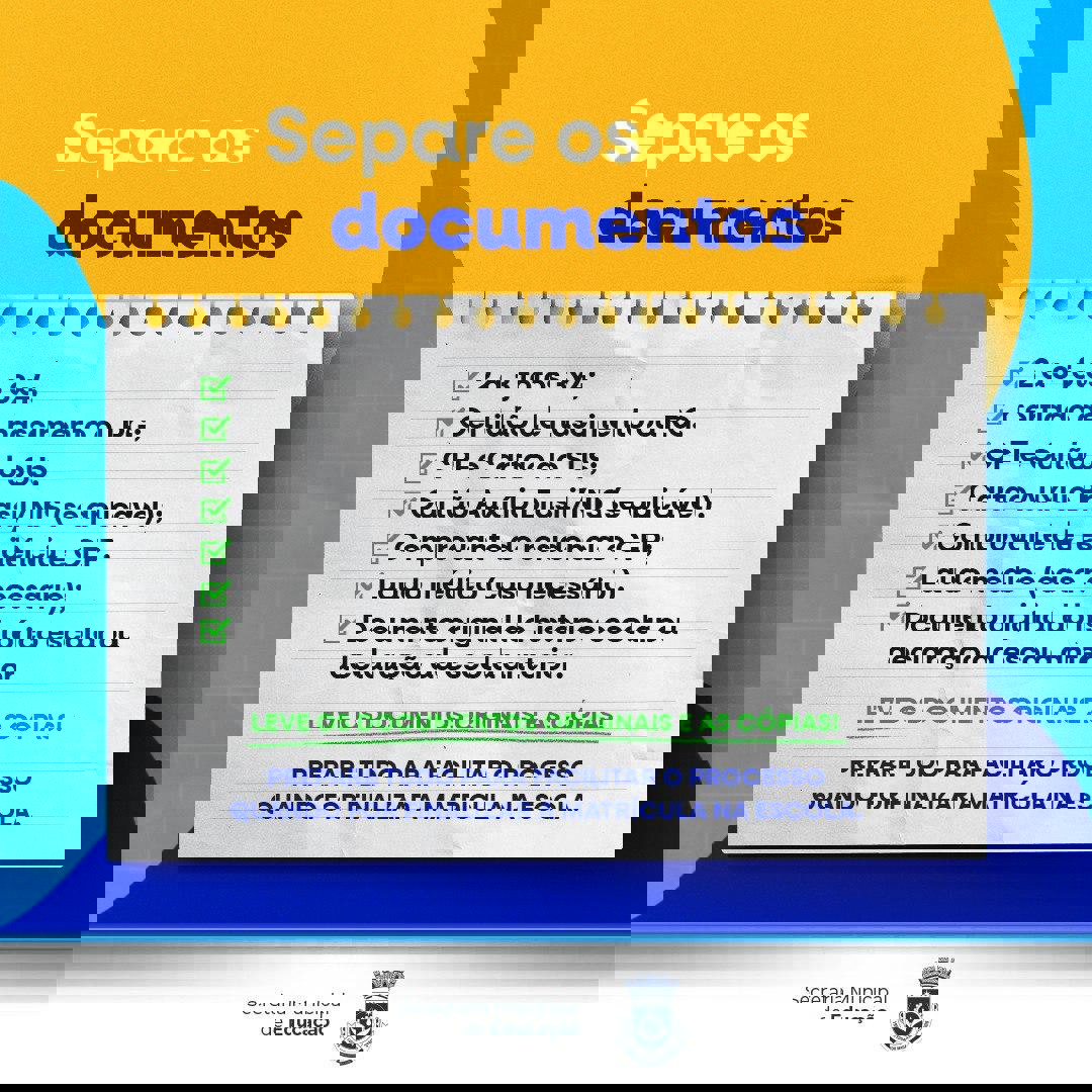 Do Responsável: I- CPF; II- RG; III- Comprovante de Residência; IV- CEP da Rua; V- Comprovante do trabalho; VI- Cartão do CadÚnico. Original do Histórico Escolar ou atestado de escolaridade; lI- 02 fotos 3 X 4 recentes; III- Certidão de Registro Civil ou Cédula de Identidade para fins de conferência; IV- CPF; V- Cartão do Auxílio Brasil/Bolsa Família - NIS; VI- Cartão do SUS; VIl- Comprovante de Residência para todos os estudantes; VIII- CEP da Rua. IX- Relatório ou laudo médico para os casos de estudantes com deficiências ou transtornos.