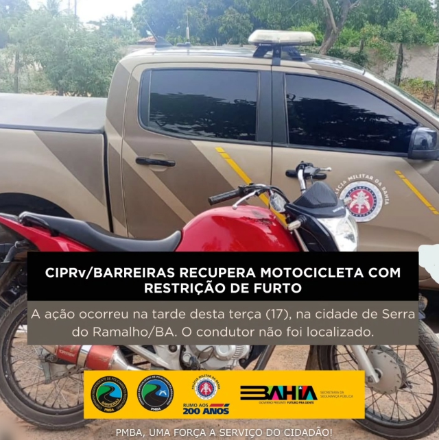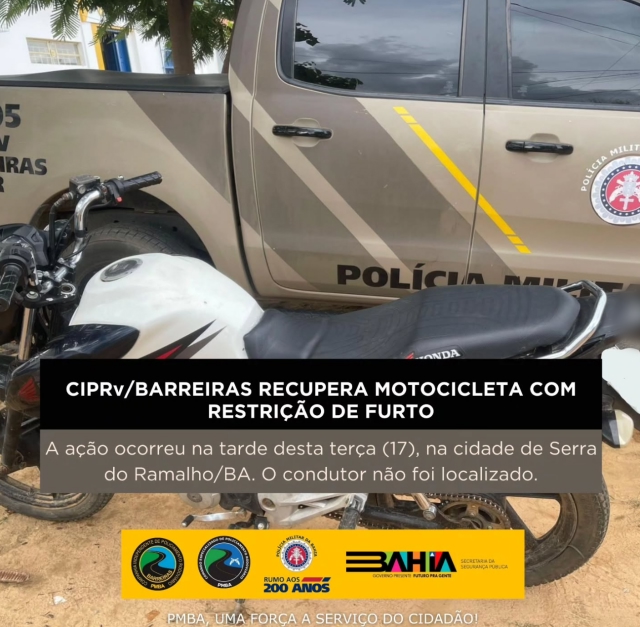 Também na mesma tarde e cidade foi recuperada pelo TOR da CIPRv/Barreiras uma motocicleta HONDA/CG 160 TITAN EX, cor branca, com os elementos identificadores adulterados. Após análise, foi possível verificar a placa original com restrição de furto